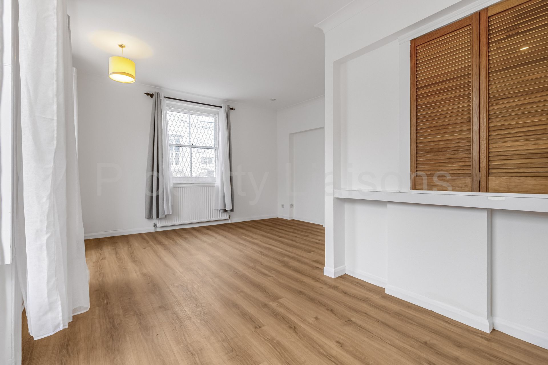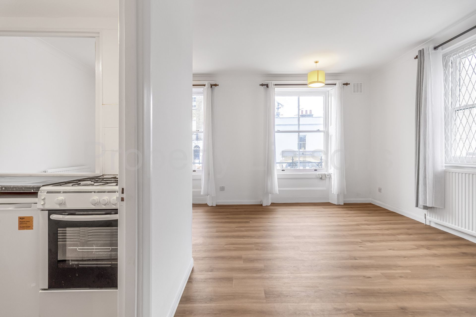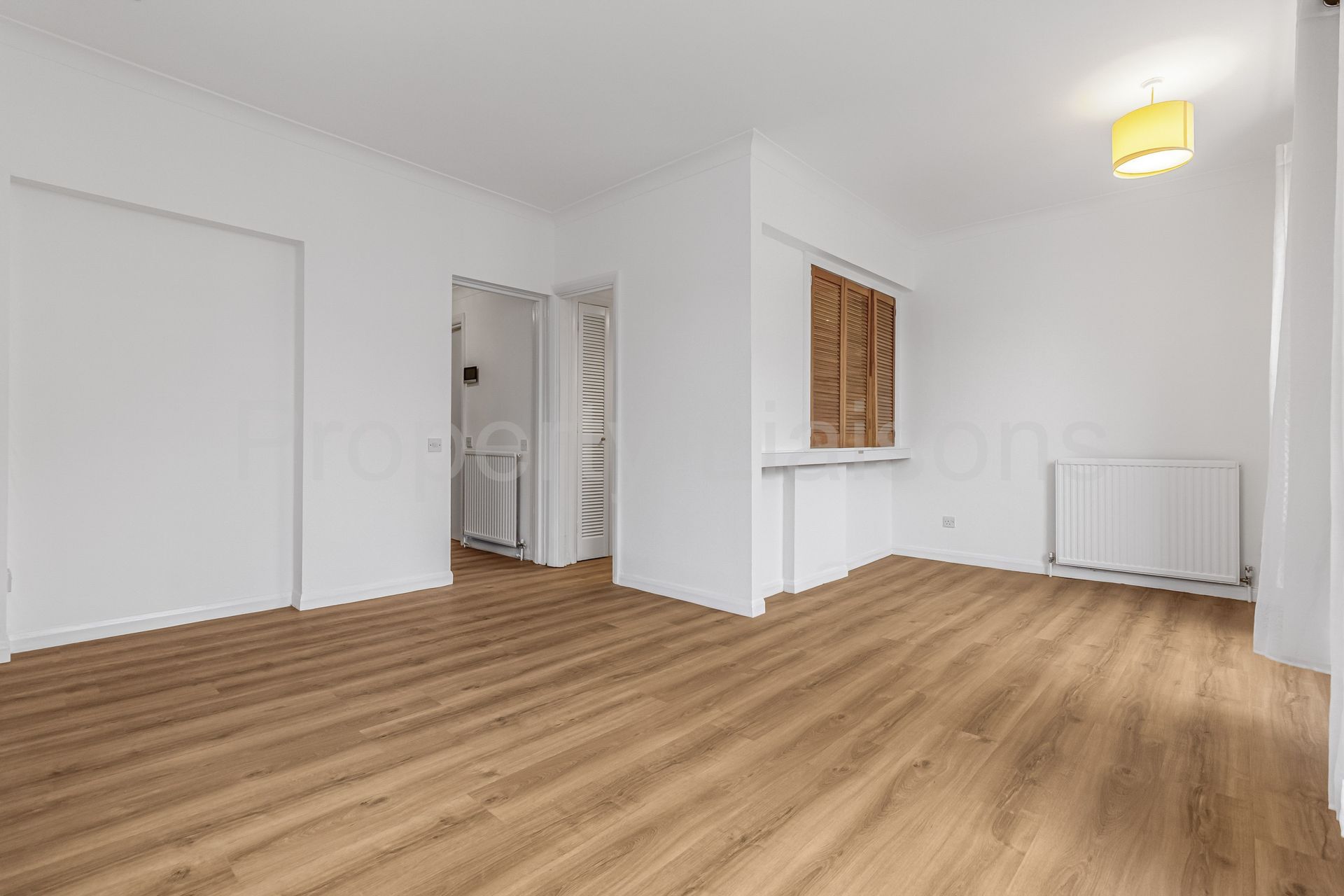 This apartment features new flooring throughout and high ceilings. There is a dual aspect reception with a separate kitchen. A bedroom that is positioned away from the road and has built in floor to ceiling wardrobes. There are also two useful storage cupboards.